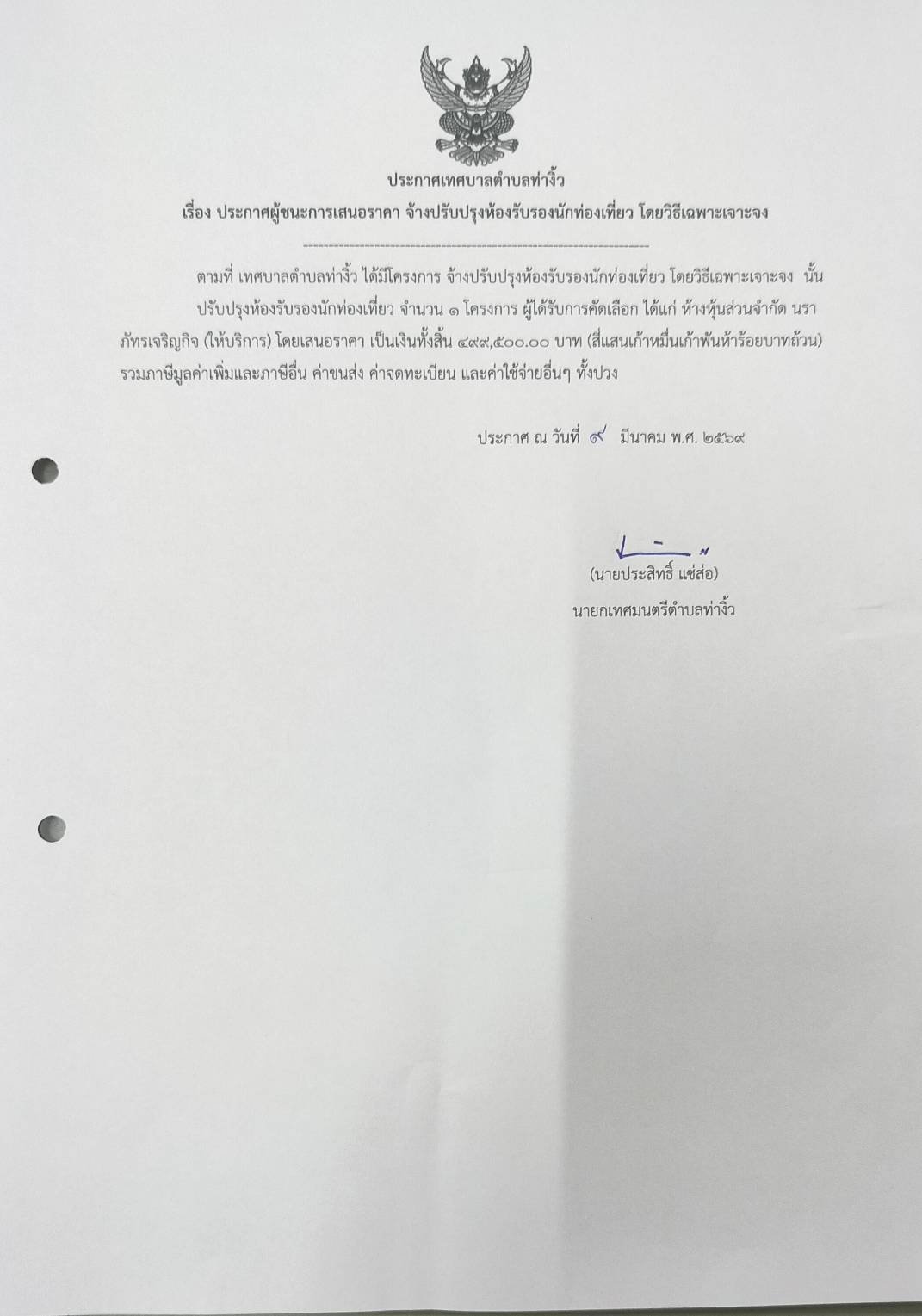 ประกาศเทศบาลตำบลท่างิ้ว เรื่อง ประกาศผู้ชนะการเสนอราคา จ้างปรับปรุงห้องรับรองนักท่องเที่ยว โดยวิธีเฉพาะเจาะจง