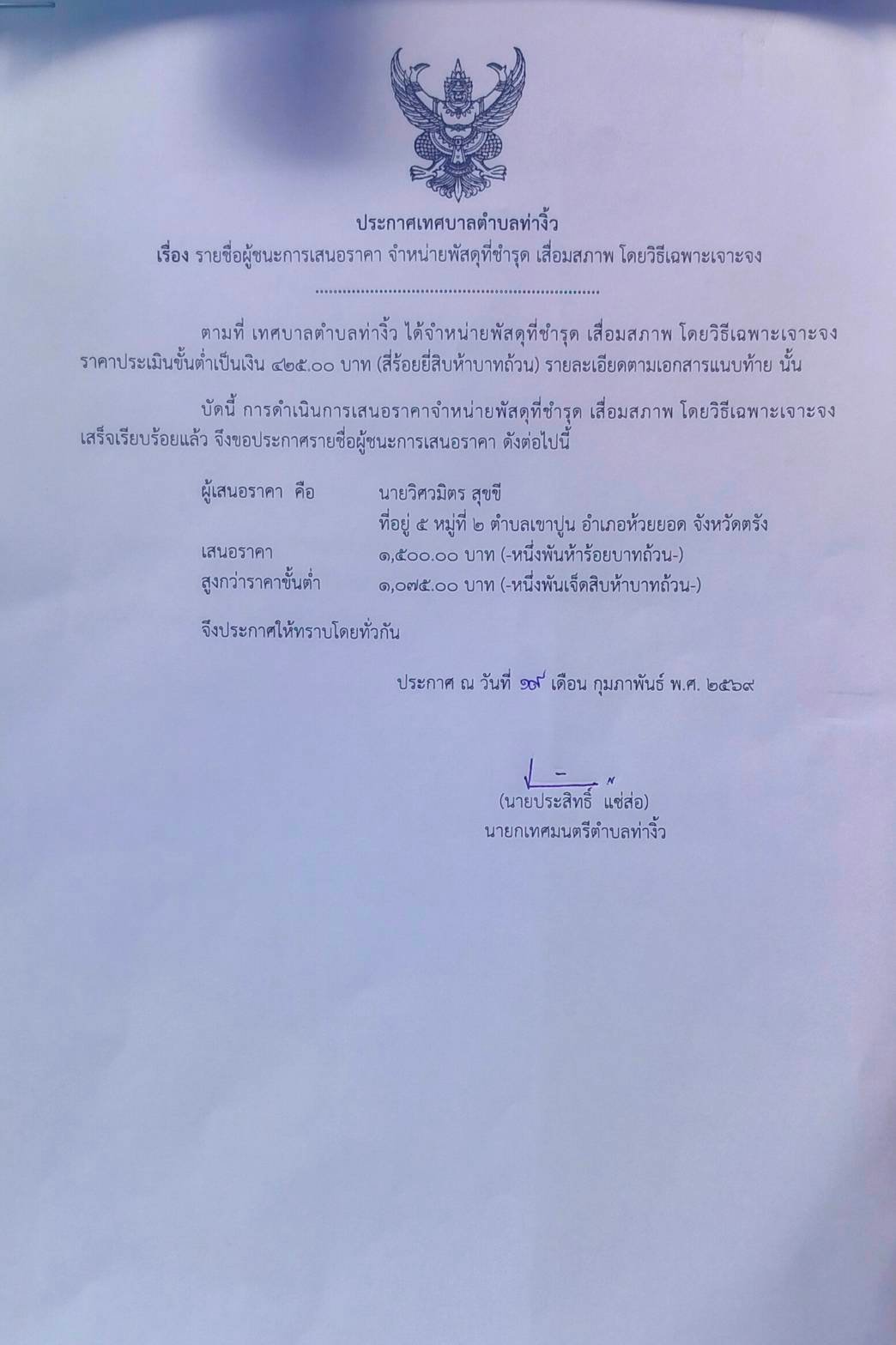ประกาศเทศบาลตำบลท่างิ้ว เรื่อง รายชื่อผู้ชนะการเสนอราคา จำหน่ายพัสดุที่ชำรุด เสื่อมสภาพ โดยวิธีเฉพาะเจาะจง