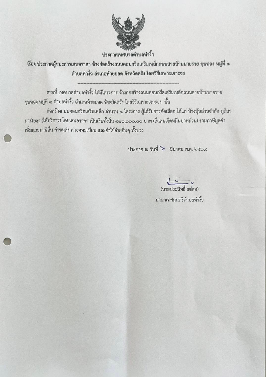 ข้อมูลสาระสำคัญในสัญญา โครงการจ้างปรับปรุงห้องรับรองนักท่องเที่ยว โดยวิธีเฉพาะเจาะจง :: ข้อมูลสาระสำคัญของสัญญาประกวดราคาจ้างก่อสร้างถนนแอสฟัลติกคอนกรีต สายตกวัดเขาปูน กว้าง ๖.๐๐ เมตร ยาว ๑,๓๐๐.๐๐ เมตร หนา ๐.๐๕ เมตร หมู่ที่ ๒,๖ ตำบลท่างิ้ว อำเภอห้วยยอด จังหวัดตรัง :: ประกาศข้อมูลสาระสำคัญของสัญญาโครงการก่อสร้างถนนคอนกรีตเสริมเหล็ก ถนนสายบ้านนายปรีดา สุดี - นายแนม เอียดดำ หมู่ที่ ๓ ตำบลท่างิ้ว อำเภอห้วยยอด จังหวัดตรัง :: ประกาศเทศบาลตำบลท่างิ้ว เรื่อง ประกาศผู้ชนะการเสนอราคา จ้างปรับปรุงห้องรับรองนักท่องเที่ยว โดยวิธีเฉพาะเจาะจง :: ข้อมูลสาระสำคัญในสัญญา โครงการจ้างก่อสร้างถนนคอนกรีตเสริมเหล็กถนนสายบ้านนายราย ขุนทอง หมู่ที่ ๑ ตำบลท่างิ้ว อำเภอห้วยยอด จังหวัดตรัง โดยวิธีเฉพาะเจาะจง :: ประชาสัมพันธ์เที่ยวน้ำตกบ่อเจ็ดลูก ตำบลท่างิ้ว อำเภอห้วยยอด จังหวัดตรัง :: ประกาศเทศบาลตำบลท่างิ้ว เรื่อง ประกาศผู้ชนะการเสนอราคา จ้างก่อสร้างถนนคอนกรีตเสริมเหล็กถนนสายบ้านนายราย ขุนทอง หมู่ที่ 1 ตำบลท่างิ้ว อำเภอห้วยยอด จังหวัดตรัง โดยวิธีเฉพาะเจาะจง :: ประกาศผุ้ชนะการเสนอราคา คก.ก่อสร้างถนนคอนกรีตเสริมเหล็ก ถนนสายบ้านนายปรีดา สุดี - นายแนม เอียดดำ หมู่ที่ 3 ตำบลท่างิ้ว อำเภอห้วยยอด จังหวัดตรัง :: ประกาศเทศบาลตำบลท่างิ้ว เรื่อง การเปิดเผยรายละเอียดค่าใช้จ่ายเกี่ยวกับการจัดซื้อจัดจ้าง ราคากลางและการคำนวณราคากลาง งานก่อสร้าง โครงการปรับปรุงห้องรับรองนักท่องเที่ยว โดยวิธีเฉพาะเจาะจง :: เปิดรับสมัครศูนย์พัฒนาเด็กเล็กตำบลท่างิ้ว เปิดรับสมัครเด็กเล็ก ประจำปี 2569 ::