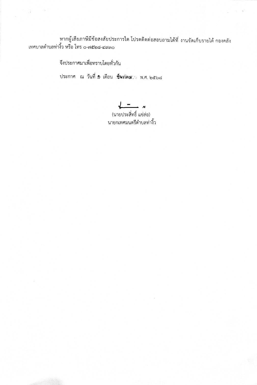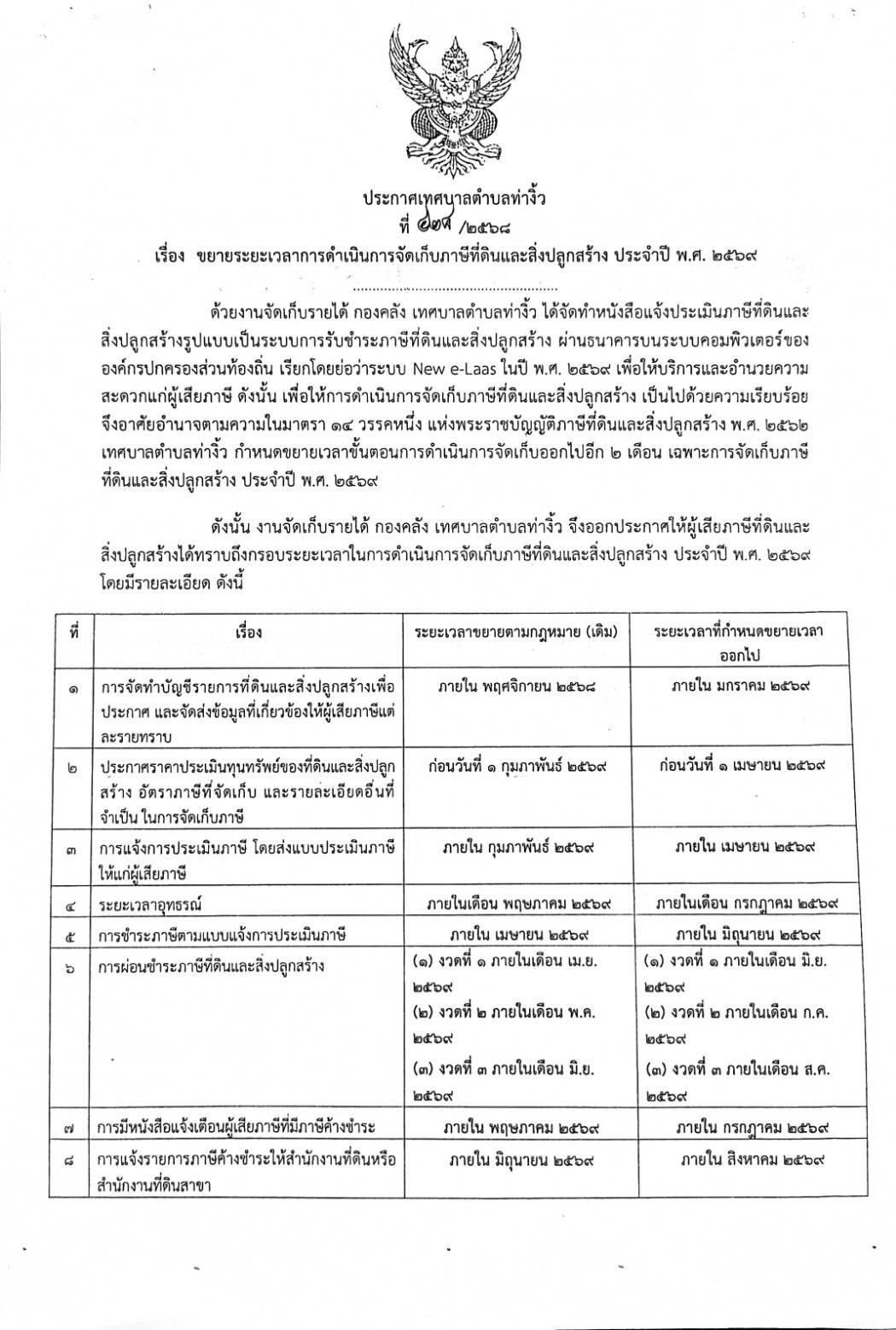 ประชาสัมพันธ์ ประกาศเทศบาลตำบลท่างิ้ว เรื่อง ขยายระยะเวลาการดำเนินการจัดเก็บภาษีที่ดินและสิ่งปลูกสร้าง ประจำปี 2569
