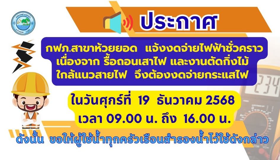 ประชาสัมพันธ์ การไฟฟ้าส่วนภูมิภาคสาขาห้วยยอด แจ้งดับไฟ