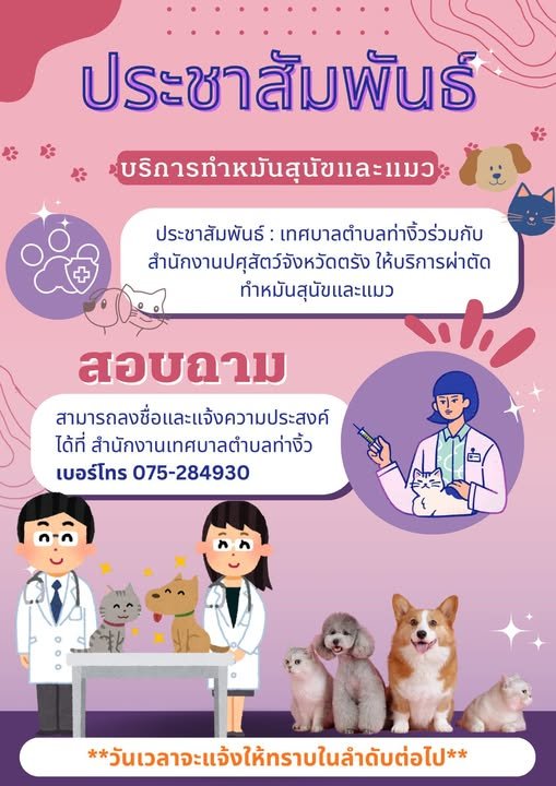 ประชาสัมพันธ์ เทศบาลตำบลท่างิ้วร่วมกับสำนักงานปศุสัตว์จังหวัดตรัง บริการทำหมันสุนัขและแมวในพื้นที่