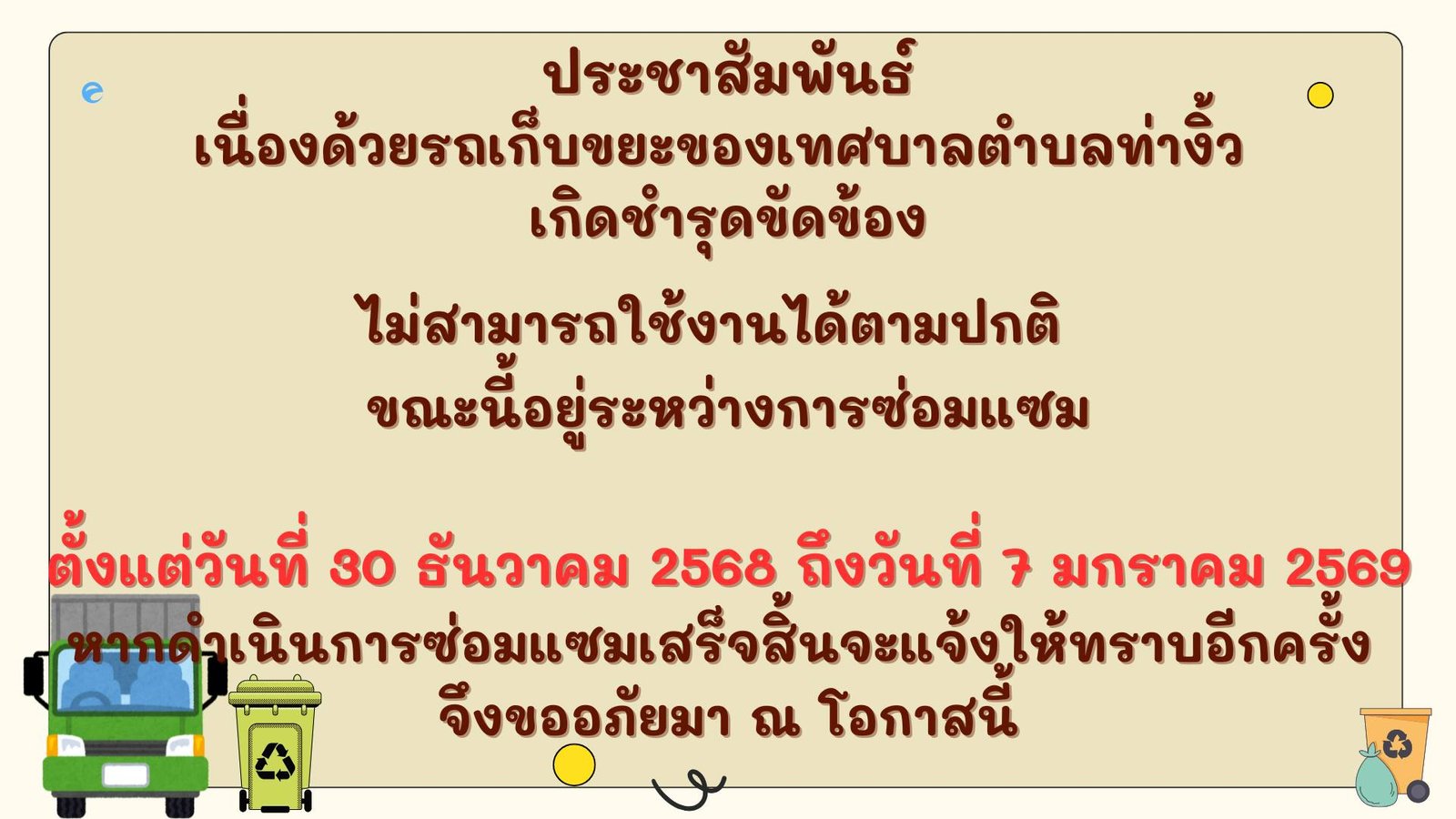 ประชาสัมพันธ์ เทศบาลตำบลท่างิ้ว รถขยะของเทศบาลเกิดชำรุดขัดข้อง⛔️ ไม่สามารถใช้งานได้